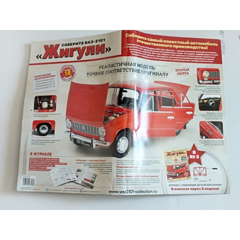 Сборная модель автомобиля ВАЗ-2101 "Жигули". Журнал (набор) № 1. Масштаб 1:8. Металл + пластик.